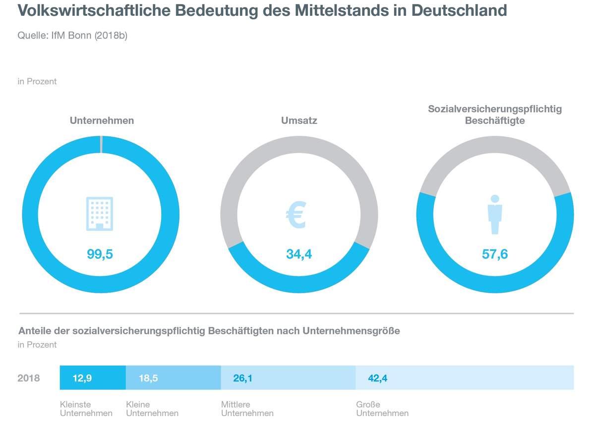 Die Kennzahlen zeigen: mittelständische Unternehmen mit bis zu 500 Mitarbeitern erwirtschaften mehr als ein Drittel des gesamten Umsatzes deutscher Unternehmen und stehen für knapp 60 Prozent aller sozialversicherungspflichtig Beschäftigte.