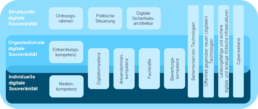 Aus obenstehenden Definitionen ergibt sich, dass Europas digitale Souveränität längst nicht nur eine staatliche Dimension beinhaltet, sondern vielmehr aus einem Zusammenspiel von strukturellen, organisationalen und individuellen Dimensionen besteht. So müssen Unternehmen die Fähigkeit besitzen, Produkte, Dienstleistungen und Infrastrukturen eigenständig entwickeln (Entwicklungskompetenz) und bei Bedarf anschließend produzieren zu können. Zudem bedarf es der Fähigkeit, Komponenten Dritter evaluieren und in eigene Systeme sicher integrieren zu können