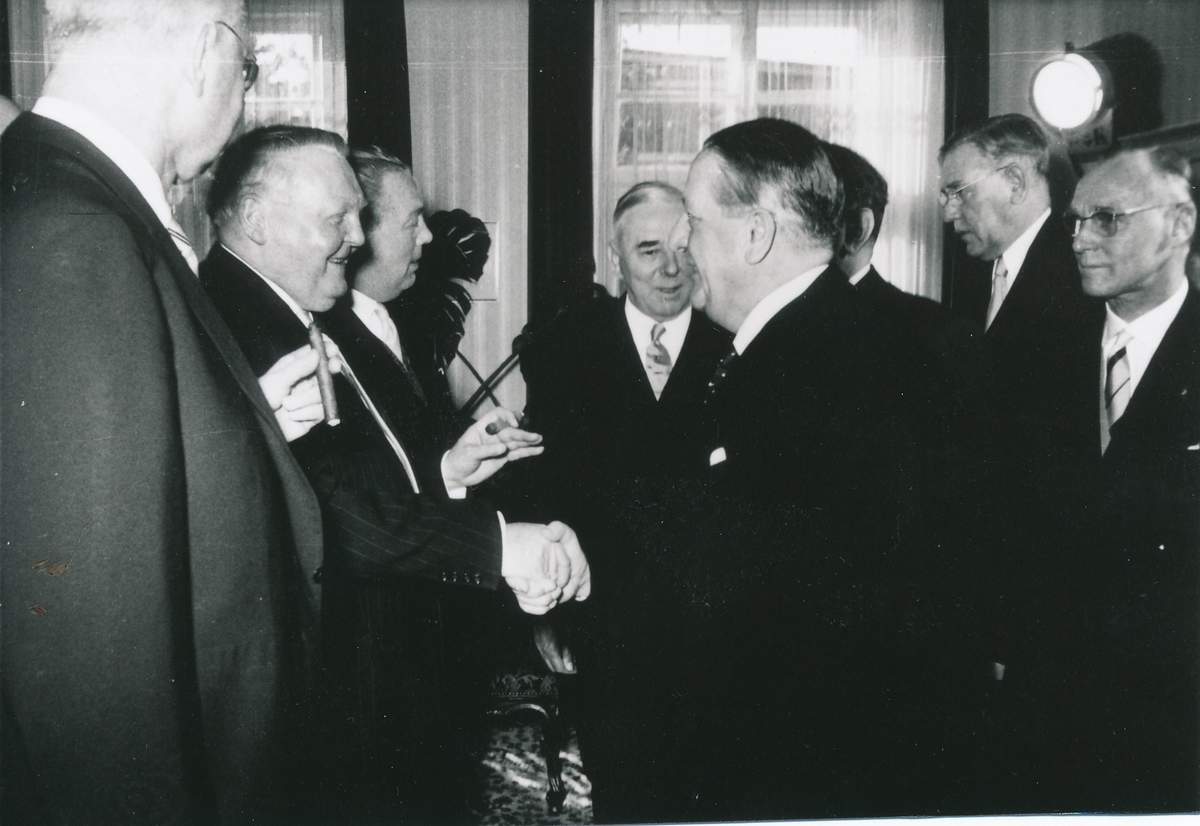 Ludwig Erhard, Bundesminister für Wirtschaft und Hans-Wilhelm Beutler, BDI-Hauptgeschäftsführer anlässlich der Kundgebung (Jahrestagung) und Mitgliederversammlung des BDI am 16. Mai 1957 in Frankfurt am Main. Daneben v.l. Franz Blücher, Vizekanzler und Bundesminister für wirtschaftliche Zusammenarbeit; Fritz Berg, BDI-Präsident, Robert Pferdmenges, Präsident des Bundesverbandes deutscher Banken sowie am Bildrand ganz rechts Siegfried Balke, Bundesminister für Atomkernenergie und Wasserwirtschaft.