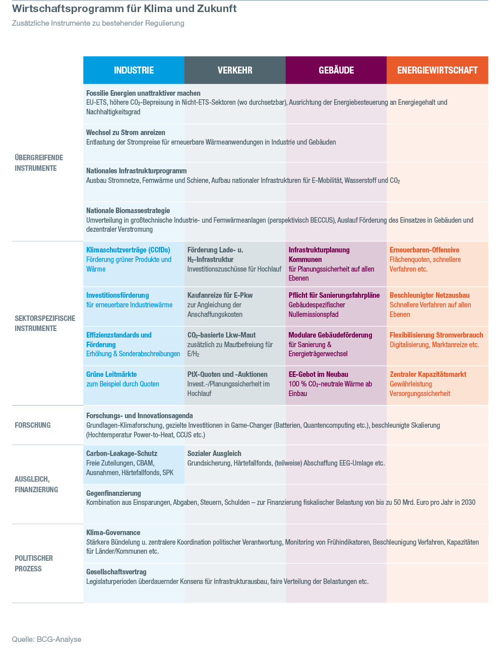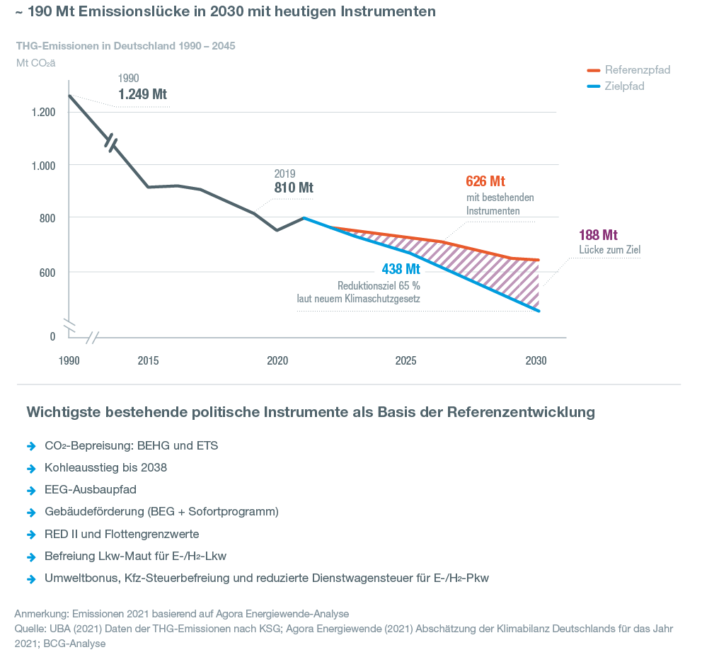 Zugleich stehen die EU bis 2050 und Deutschland bis 2045 mit ihren ehrgeizigen Klimaneutralitätszielen unverändert vor gewaltigen Herausforderungen für Gesellschaft, Verwaltung, Wirtschaft und Wissenschaft. Denn der Umbau zu einem klimaneutralen Industrieland erfordert eine Transformation in allen Bereichen von Wirtschaft und Gesellschaft. Deutschland muss bis 2030, also innerhalb von acht Jahren, seine Emissionen fast halbieren. Die BDI-Studie „Klimapfade 2.0“ untersucht, welche Instrumente hierfür nötig sind. Sie zeigt, dass die Industrie mit ihren Technologien der zentrale Wegbereiter für erfolgreichen Klimaschutz ist. Damit deutsche Unternehmen international wettbewerbsfähig bleiben, sind folgende Punkte aus Sicht des BDI nach wie vor zentral: