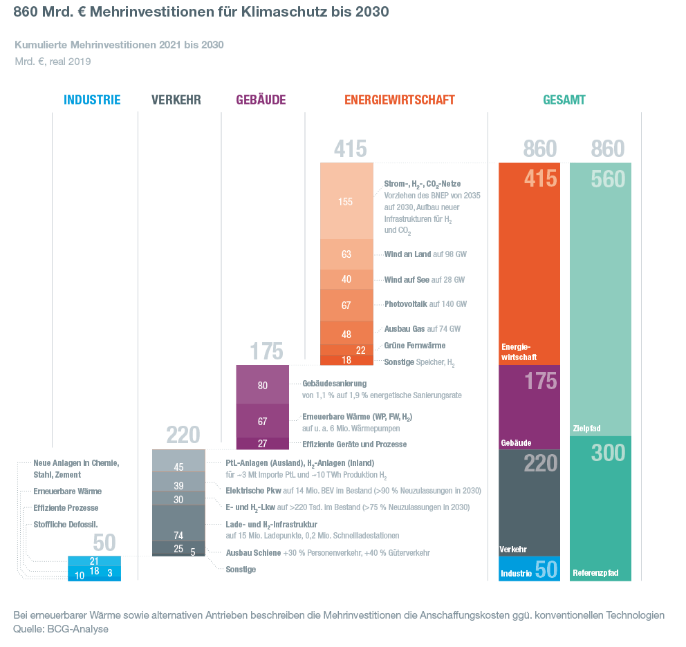 - Insgesamt gibt es bis 2030 – also über die nächsten neun Jahre – einen Bedarf von 860 Milliarden Euro Mehrinvestitionen. Angesichts von Inflation und gestiegenen Energiekosten dürfte diese Summe inzwischen noch höher liegen.
