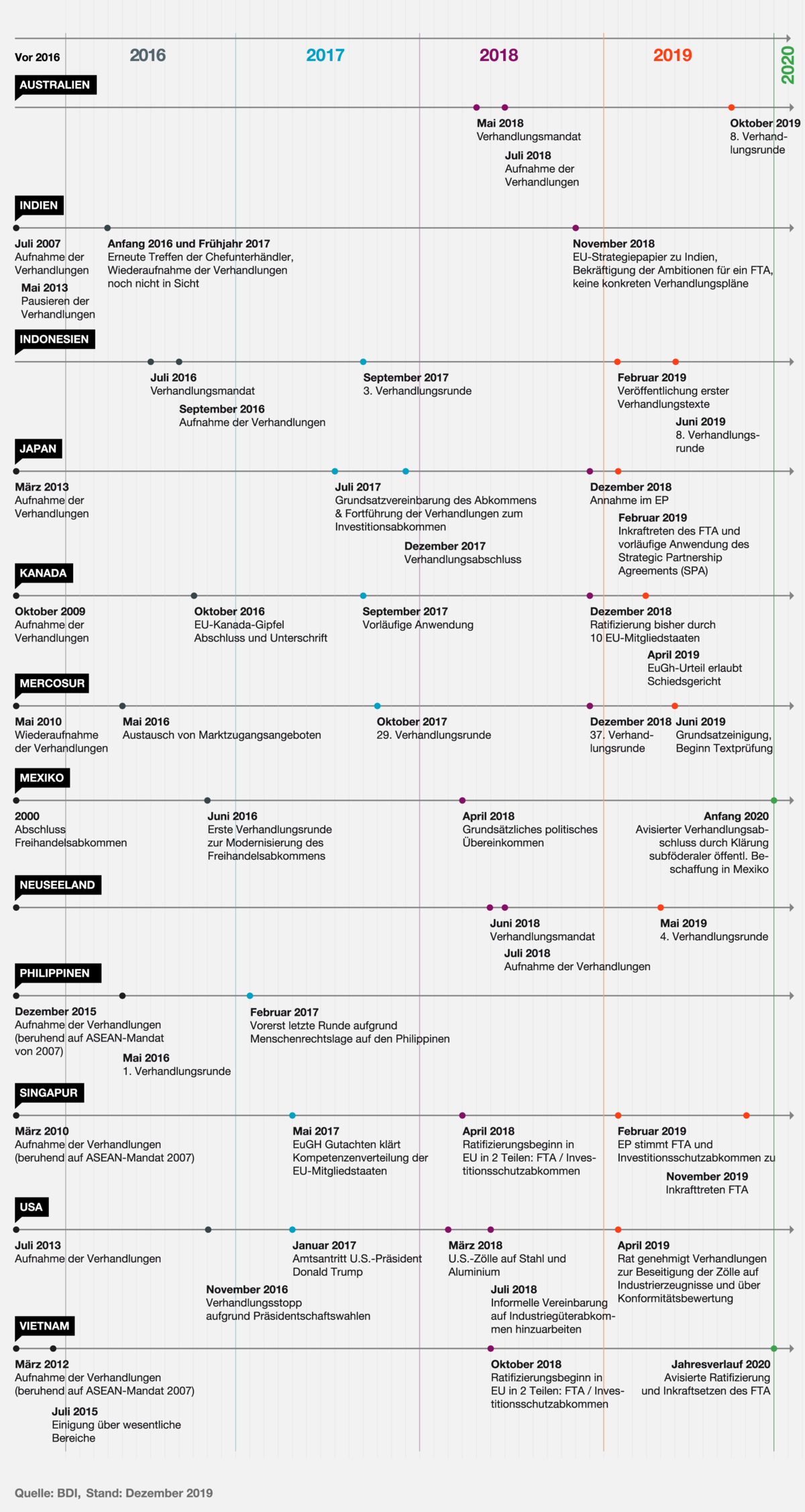 Mit rund einem Dutzend Partnerstaaten hat die EU bereits moderne Handelsabkommen abgeschlossen; mit zahlreichen weiteren Ländern sollen FTAs noch geschaffen oder modernisiert werden. Die Verhandlungen dauern oft viele Jahre. Gründe für die Verzögerungen sind die große Zahl an verschiedenen Verhandlungsgebieten, politische Veränderungen wie Regierungswechsel, Krisen wie die Corona-Pandemie und begrenzte personelle Ressourcen der Verhandlungsteams. 20 Jahre hat es gedauert, bis sich die Europäische Kommission im Juni 2019 mit den Mercosur-Staaten auf ein FTA einigen konnte. Und bis der Vertrag unterschriftsreif ist, müssen noch weitere Monate in Detailarbeit investiert werden. Die Gesetzgeber rechnen erst in der zweiten Jahreshälfte 2020 mit der Vorlage des Abkommens.
