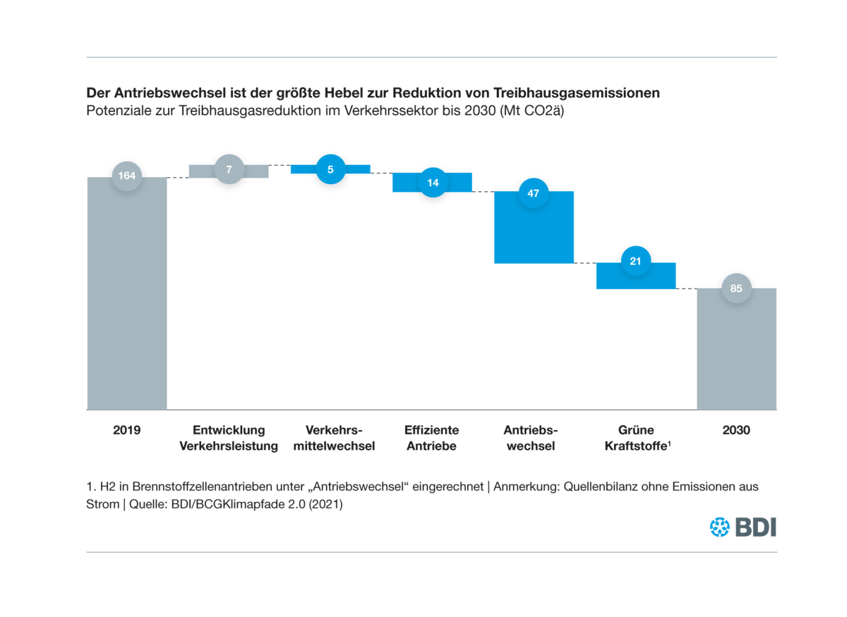 Im Folgenden werden bereits bestehende, in der BDI/BCG-Klimapfadestudie 2.0 geforderte, sowie neue Instrumente aufgeführt, die aus Sicht des BDI dazu beitragen, den politisch gesetzten Klimapfad für Deutschland im Verkehrssektor voranzutreiben. Viele dieser Instrumente befinden sich aktuell im politischen Entscheidungsprozess und können daher ihre dringend erforderliche Wirkung noch nicht entfalten. Es ist somit zwingend nötig, dass die federführenden Ressorts ihre Verantwortung übernehmen und die Regularien im Deutschland-Tempo umsetzen. Zudem ist die Bundesregierung aufgefordert, sich bei den noch zu verabschiedenden europäischen Dossiers Energiesteuerrichtlinie (ETD) sowie CO2-Flottenregulierung schwere Nutzfahrzeuge engagiert für eine europaweit ambitionierte, harmonisierte und praxisorientierte Ausgestaltung einzusetzen. Im Luft- und Seeverkehr ist dabei der internationalen Wettbewerbssituation Rechnung zu tragen. Nur mit den entsprechenden Rahmenbedingungen kann der Verkehr seinen Beitrag zum Klimaschutz leisten und die Wettbewerbsfähigkeit des Wirtschaftsstandorts Deutschland aufrechterhalten werden.