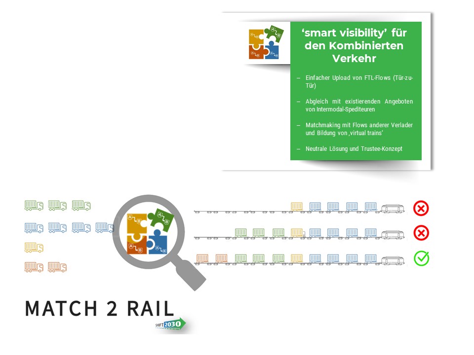 Wir haben beispielsweise mit der Action Match2Rail gemeinsam mit unserem Partner digi-trust eine digitale Plattform entwickelt, mit der Verlader ganz leicht ihre Transportströme (Tür-zu-Tür) mit bereits existierenden Verbindungen im Kombinierten Verkehr abgleichen können. Gleichzeitig bündeln wir Sendungsmengen, für die es heute noch kein attraktives Angebot gibt und bilden so genannte 'Virtual Trains', um darauf aufbauend neue Verbindungen zu schaffen. Damit geben wir Verladern einen Überblick der passenden Intermodal-Spediteure für ihre Transporte und erweitern darüber hinaus das Angebot im Kombinierten Verkehr.