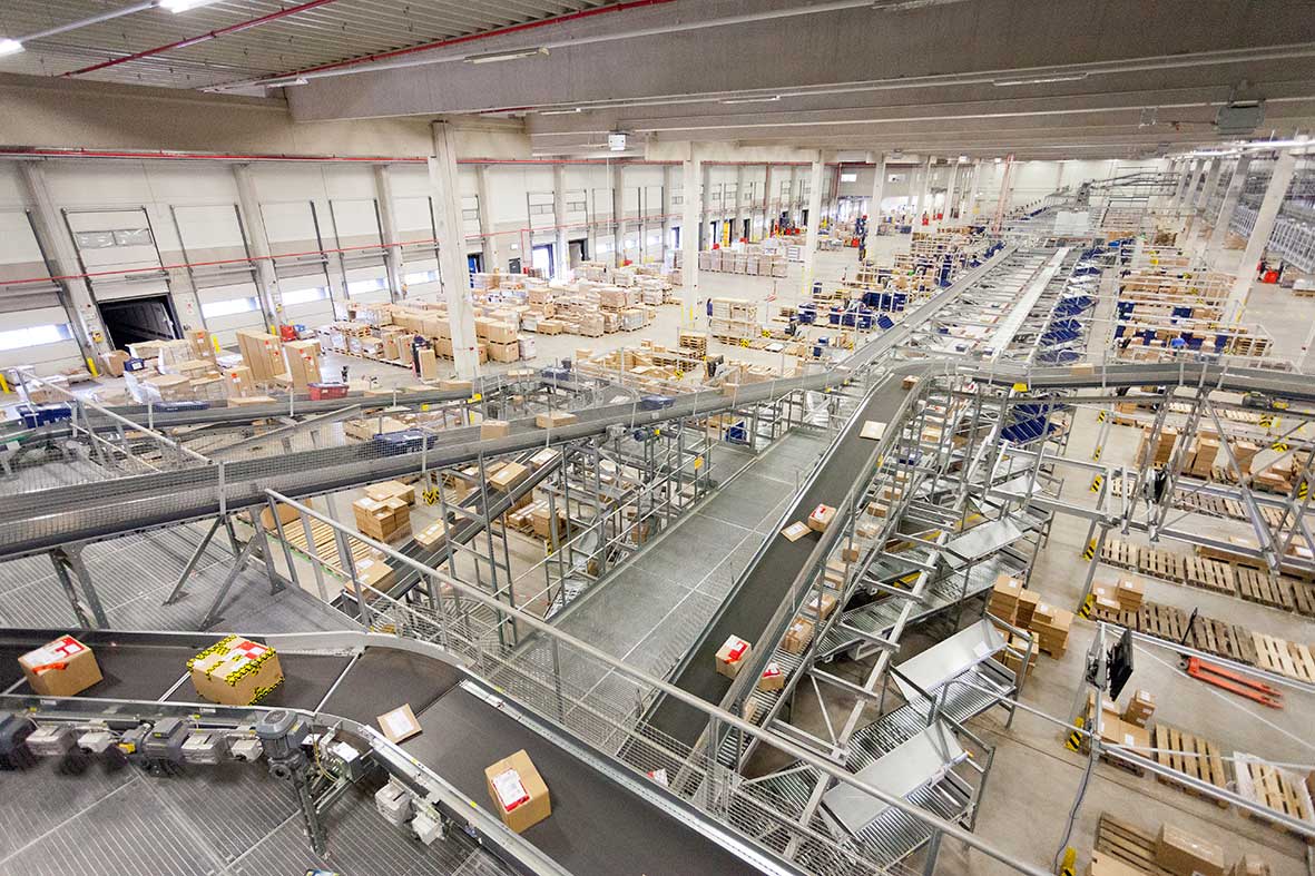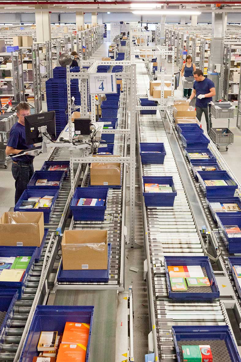 Im Logistikzentrum werden alle angelieferten Bücher in Wannen umgepackt und über ein kilometerlanges Netz von Transportbahnen in ein dynamisches Hochregallager befördert. Hier finden sie vollautomatisch ihren Platz, auf dem sie so lange verbleiben, bis sie zum Versand herausgeholt werden.