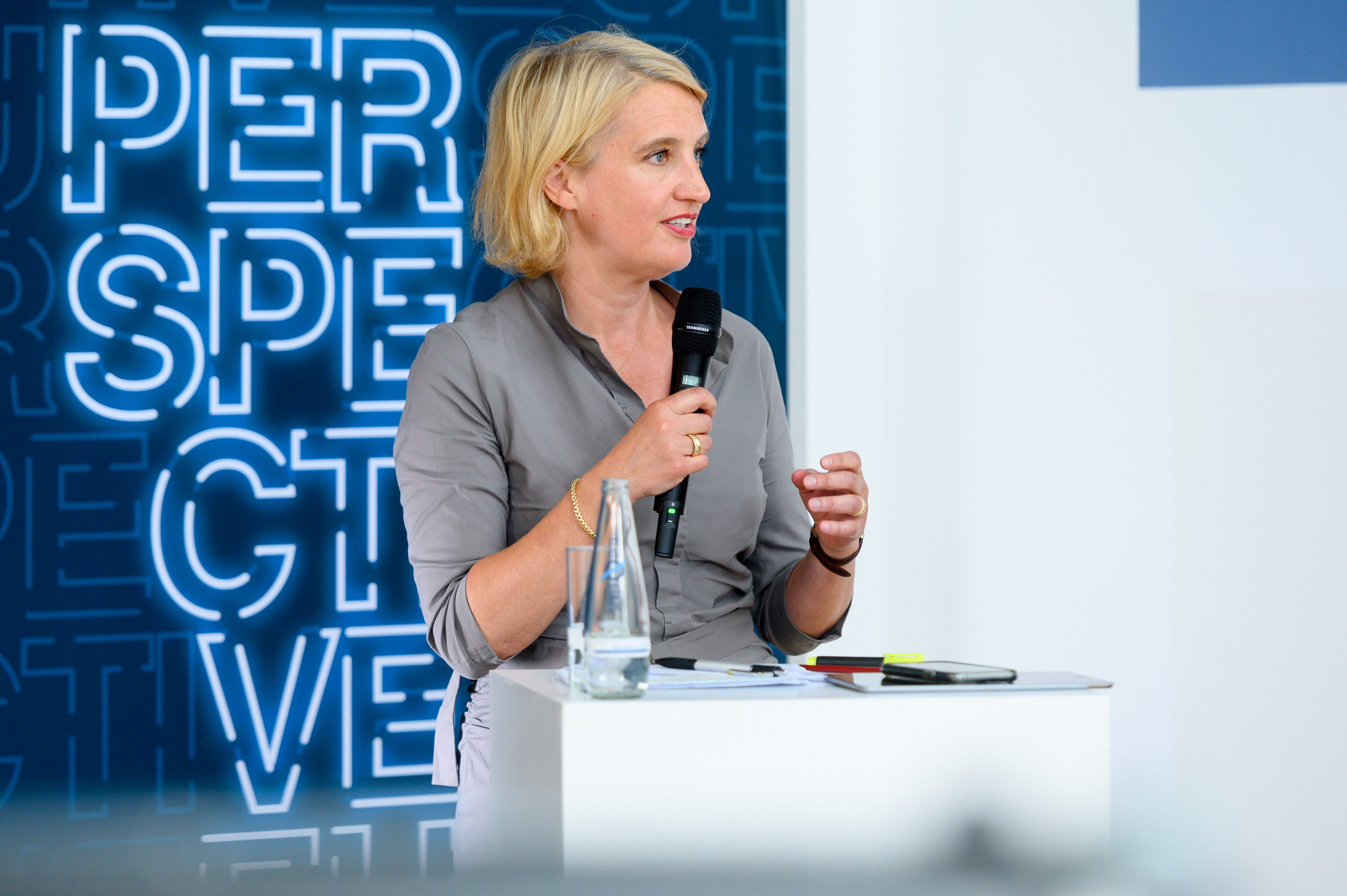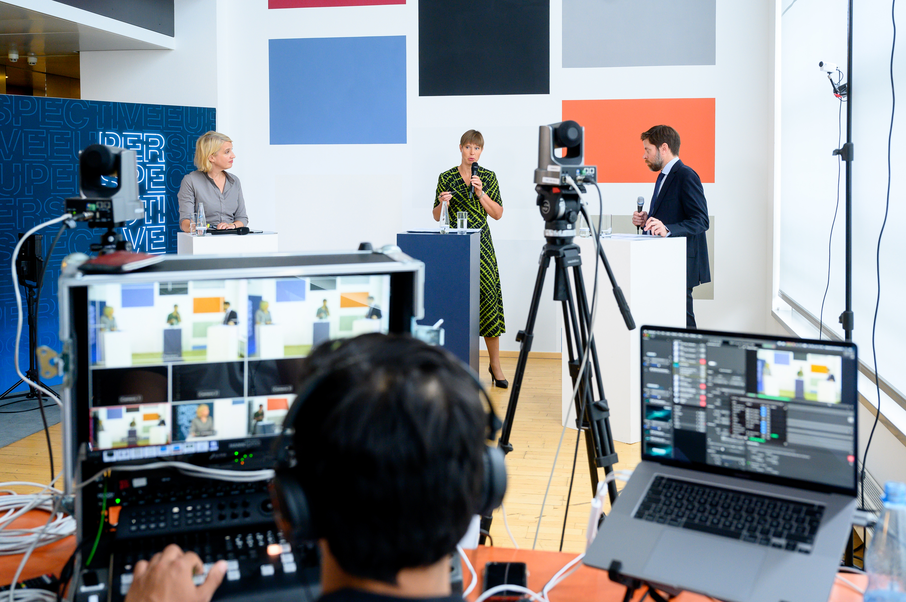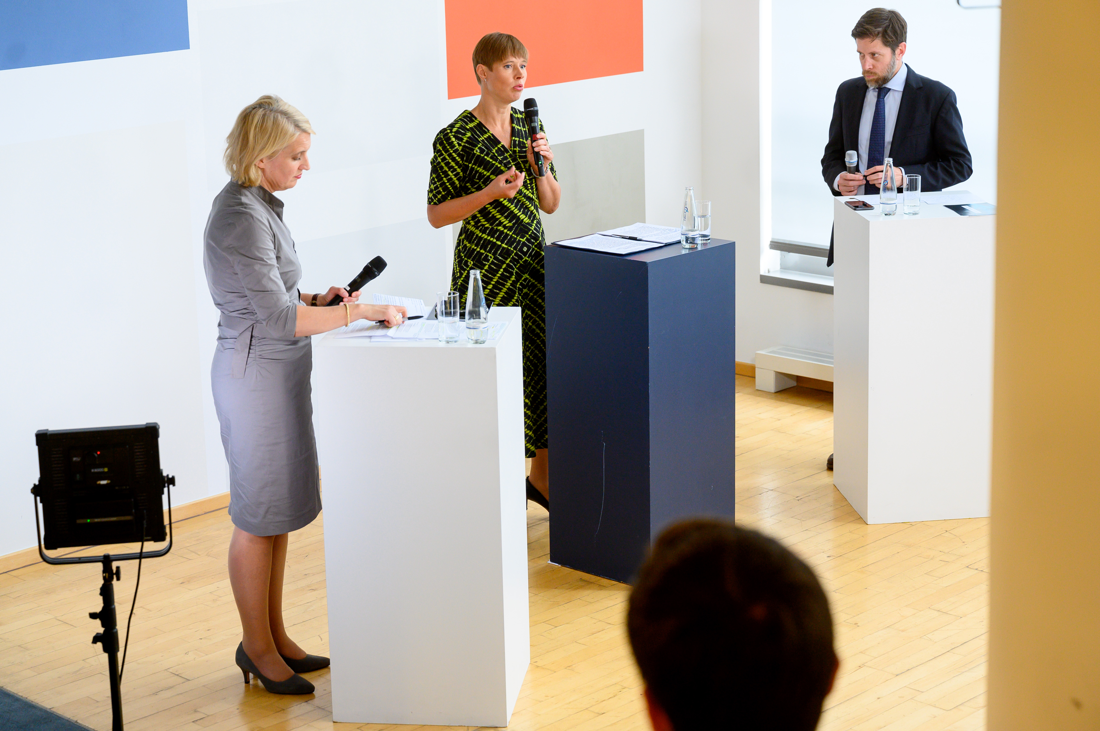 BDI-Hauptgeschäftsführungsmitglied Iris Plöger, Präsidentin Kersti Kaljulaid und Journalist Matthew Karnitschnig (v.l.n.r.) © BDI