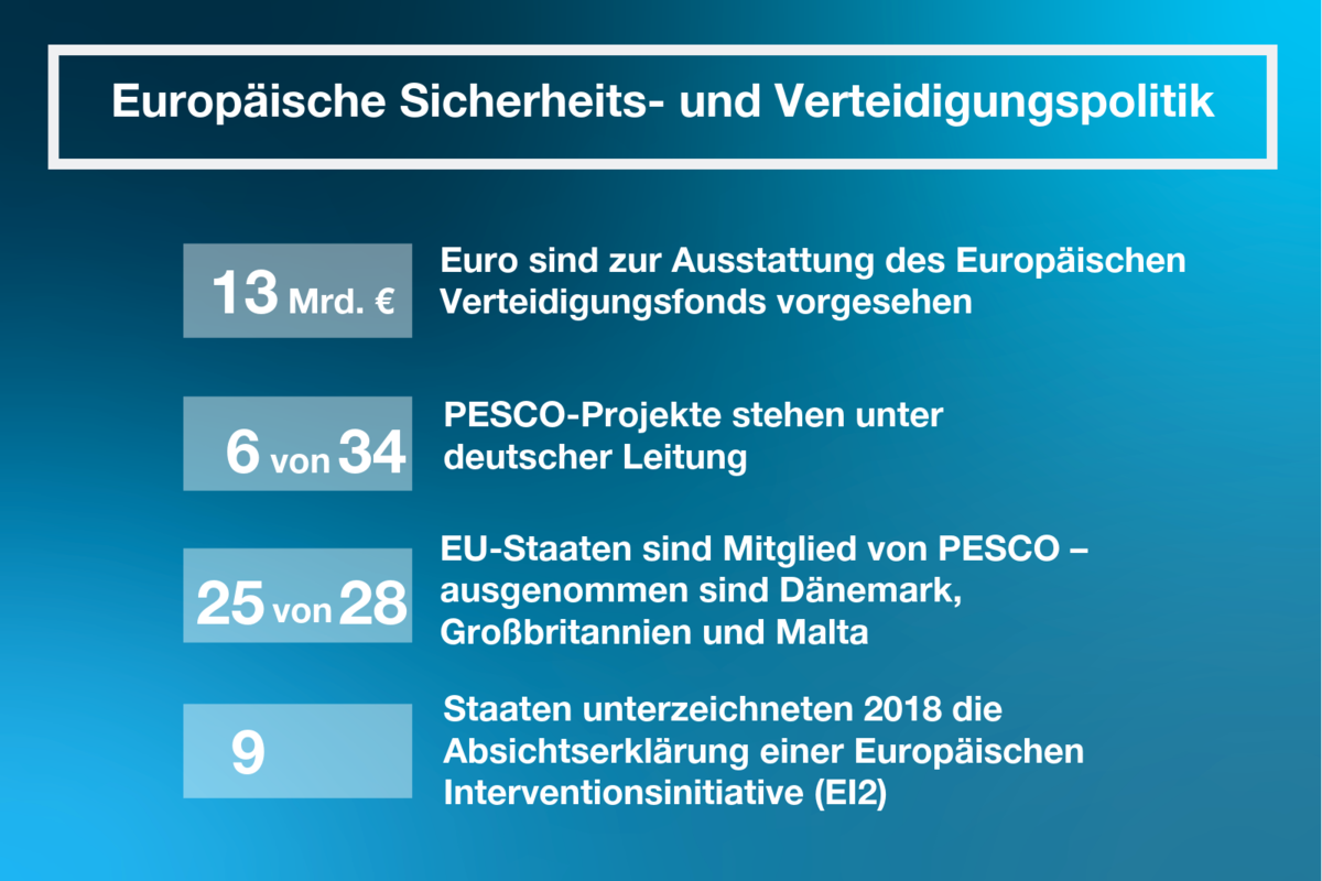 Europa ist zuallererst ein Friedensprojekt – und muss diese Funktion auch in Zukunft erfüllen können. Denn Wohlstand und Freiheit für die Bürgerinnen und Bürger der EU ist ohne Frieden und Sicherheit nicht möglich. In einer Welt, die von zunehmender Instabilität und grenzübergreifenden Bedrohungen geprägt ist, kann kein Land allein diese Sicherheit gewährleisten. Nur eine nach innen und außen geeinte EU kann wirtschaftliche und sicherheitspolitische Strukturen international mitgestalten. Um als eigenständiger Impulsgeber in der Außen- und Sicherheitspolitik wahrgenommen zu werden, müssen die EU-Mitgliedsstaaten ihre Zusammenarbeit deutlich vertiefen. Ein Baustein einer intensivierten Kooperation ist, gemeinsame Entwicklungs- und Beschaffungsprojekte von Rüstungsgütern voranzutreiben. Nur so können Effektivität und Effizienz gesteigert sowie technologische Souveränität gesichert werden.