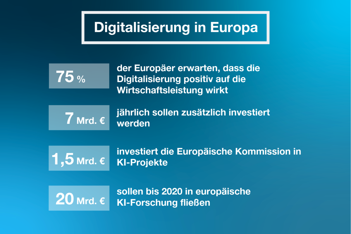Allein durch eine konsequente Fokussierung auf Künstliche Intelligenz (KI) könnte Europa seine Wirtschaftsleistung bis zum Jahr 2030 um 2,7 Billionen Euro oder 19 Prozentpunkte erhöhen. Und KI ist nur eine von vielen digitalen Zukunftstechnologien, die Unternehmen in Europa und weltweit in den kommenden Jahren in erfolgreiche Geschäftsmodelle umwandeln und zur Lösung aktueller gesellschaftlicher und wirtschaftlicher Herausforderungen einsetzen werden. Das wirtschaftliche Potenzial eines vertieften digitalen Binnenmarktes liegt schätzungsweise bei bis zu 415 Milliarden Euro jährlich.