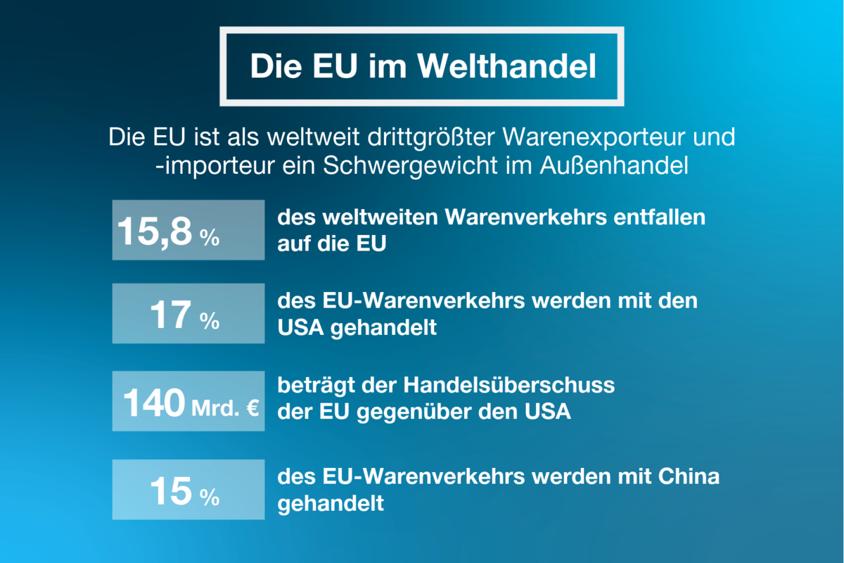 Vor dem Hintergrund des Handelsstreits zwischen den USA und China ist die EU als zweitstärkste Wirtschaftsmacht der Welt besonders gefragt: Sie muss ein Zeichen für freien und fairen Handel setzen und gegen alle Formen des Protektionismus vorgehen. In Zeiten der Globalisierung werden offene Märkte für Handel und Investitionen immer wichtiger, um den europäischen Wohlstand abzusichern und Wohlstand weltweit zu ermöglichen. Ganze 46 Prozent der EU-Wirtschaftsleistung basieren auf dem Außenhandel. Freihandel und offene Märkte sichern nicht nur Arbeitsplätze, sondern auch niedrige Preise und eine breite Produktauswahl in Europa. Die EU muss ihre ambitionierte bilaterale Verhandlungsagenda mit Nachdruck vorantreiben und vor allem den Austausch mit den USA, den ASEAN- und Mercosur-Staaten sowie weiteren großen Märkten liberalisieren.